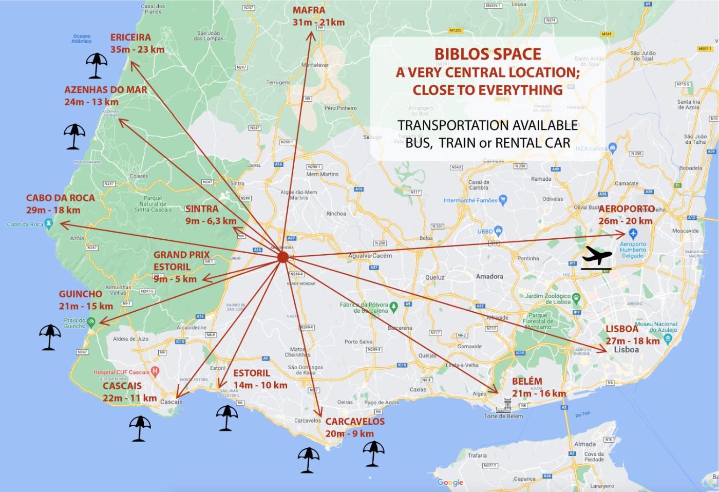 Palácio Nacional fica a 7 km de Espaço BIBLOS, enquanto Estádio da Luz está a 20 km da propriedade. O Aeroporto Municipal de Cascais fica a 7 km de distância.
